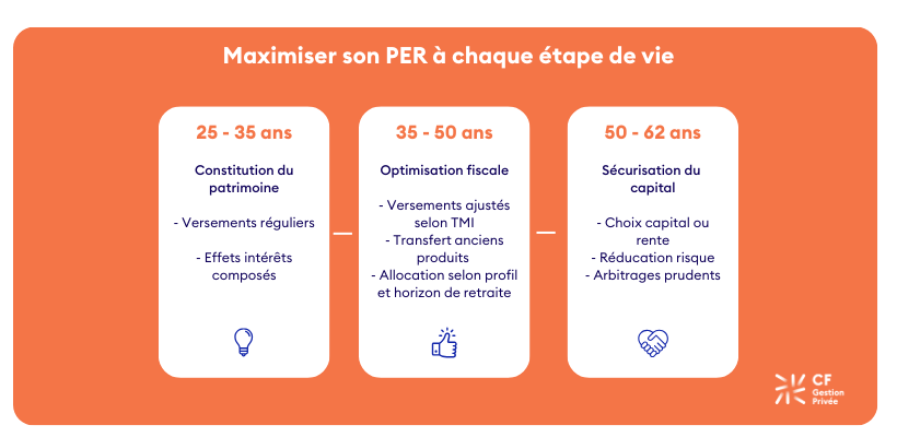 Par ailleurs, optimiser son PER se fait étape par étape. Selon l’âge, il peut être opportun d’adapter ses versements et son allocation pour maximiser votre capital et vos avantages fiscaux.